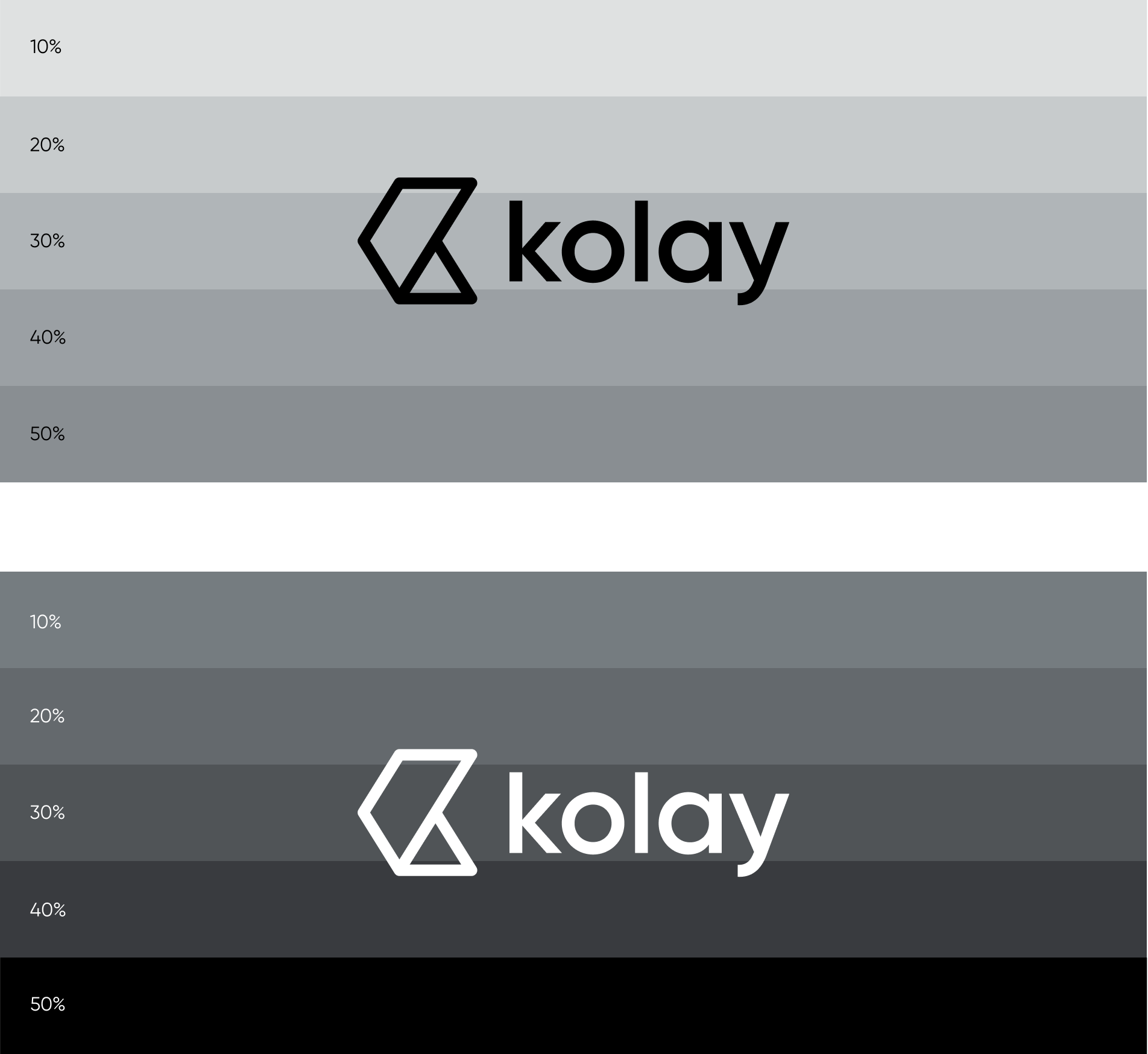 Kolay logotypeı; beyaz, açık ton ve pastel zeminler üzerinde açık mavi Kolay sembolü ile kullanılmalıdır.